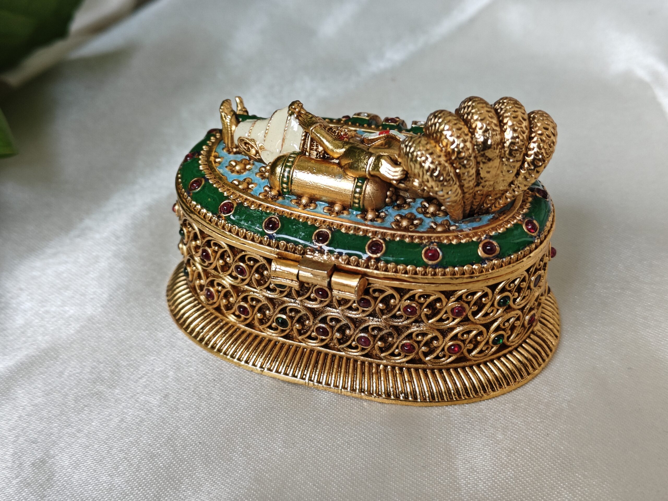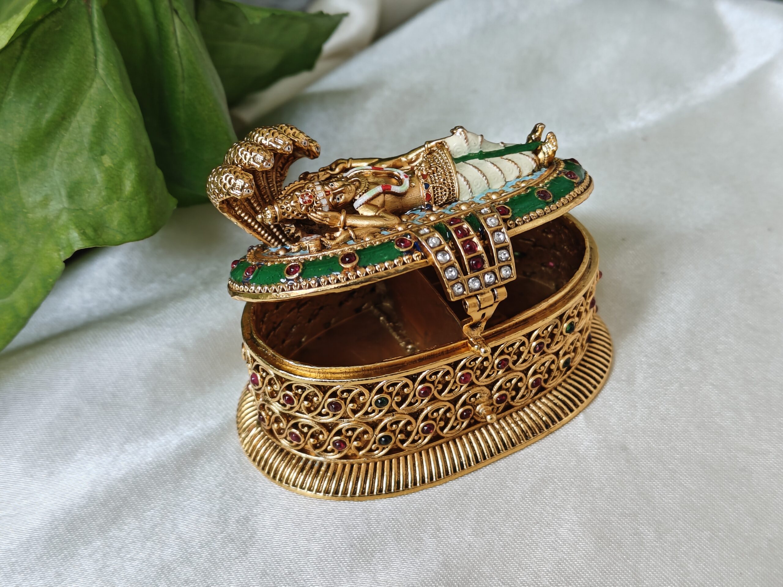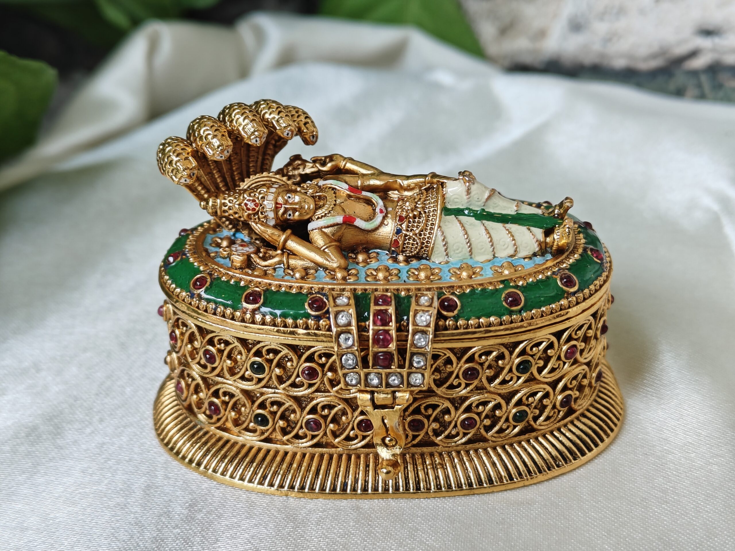 Exquisite Anantha Shayana Vishnu jewellery box featuring rich antique gold work, colourful stones and intricate temple detailing. Ideal for pooja décor and premium gifting.