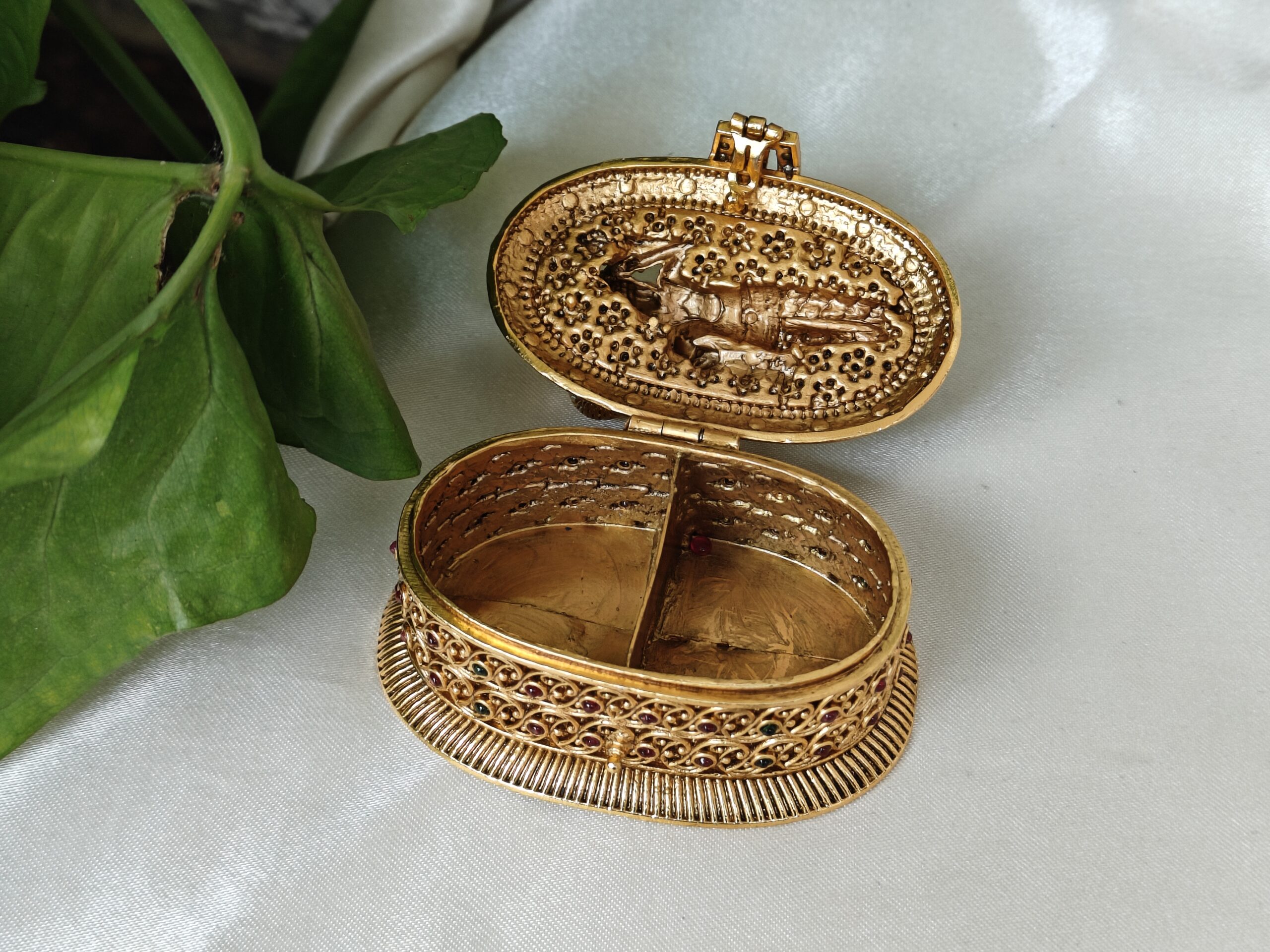 The box features elaborate nakshi work, colourful stone embellishments, and an antique gold finish that adds richness to any pooja room, décor setting or gifting collection.