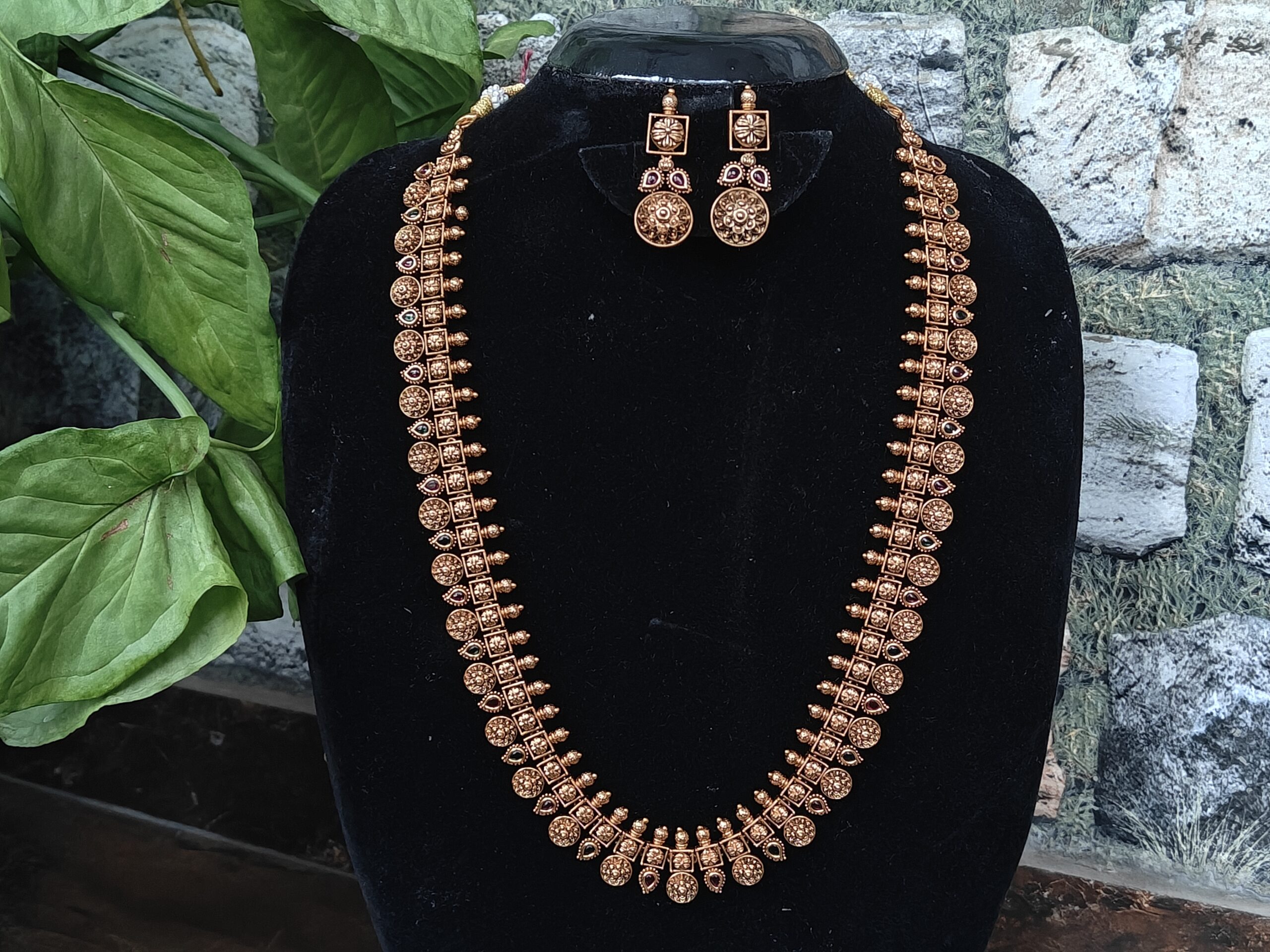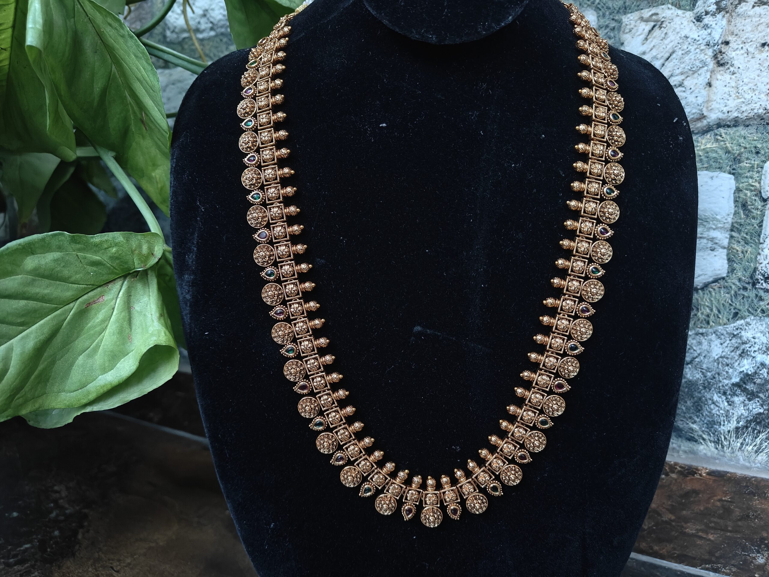 Crafted in an antique gold finish, this necklace features delicately carved mango elements arranged in a graceful bottumala pattern.