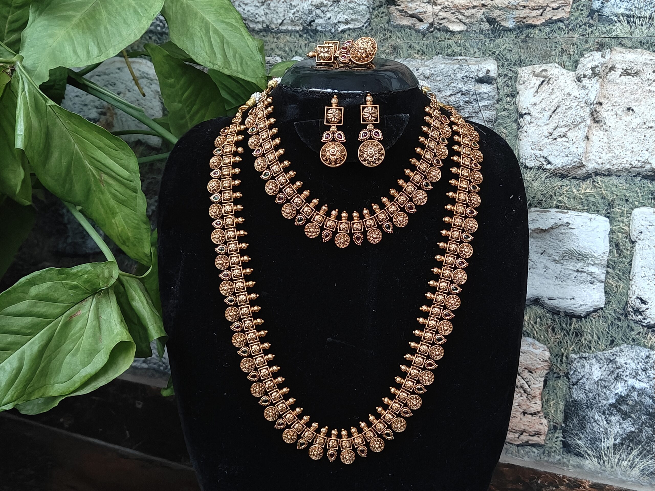 The antique gold finish enhances the intricate detailing, giving the set a timeless temple-jewellery appeal.