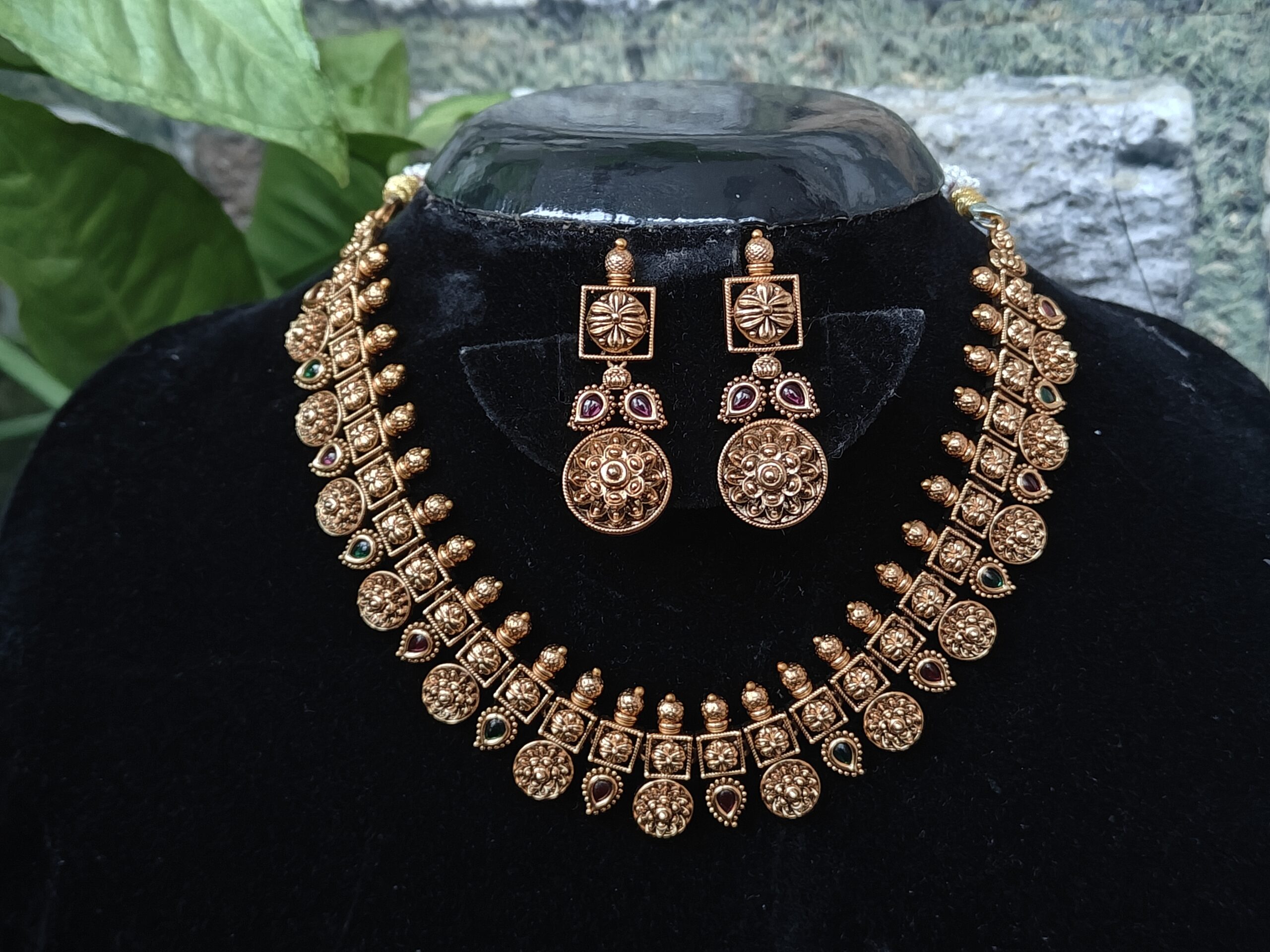 Crafted in an antique gold finish, this necklace features delicately carved mango elements arranged in a graceful bottumala pattern.