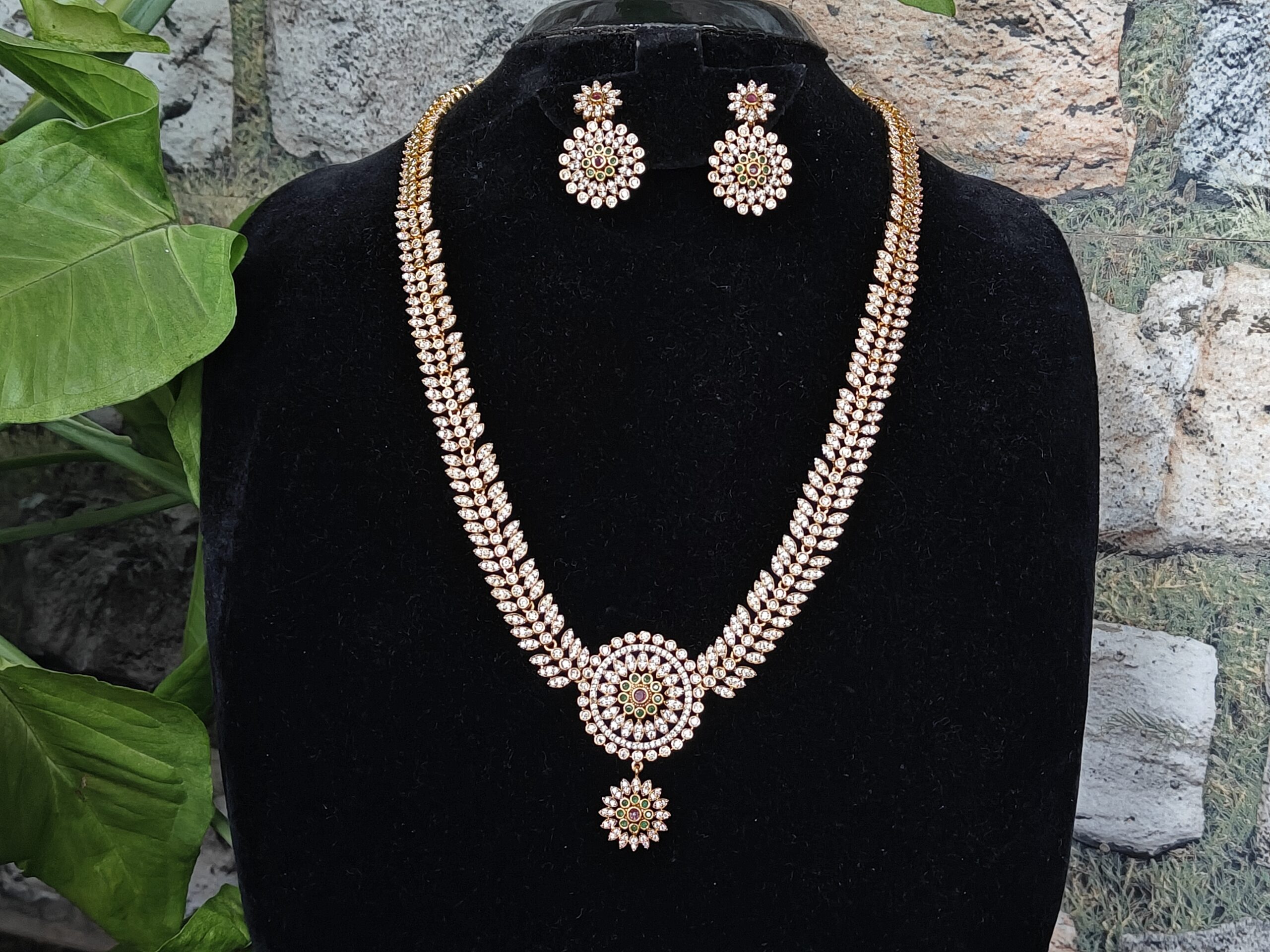 The CZ Long Necklace NFN191 is designed to drape beautifully, adding sophistication and sparkle to any outfit. The necklace is crafted with premium cubic zirconia, arranged in an elegant pattern that reflects light beautifully. Its generous length makes it versatile: layer over ethnic outfits like sarees and lehengas, or pair with modern gowns and dresses. Despite its size, it’s surprisingly lightweight and engineered for comfortable wear. A great choice for brides, or for anyone looking to elevate their style with a refined, shimmering accessory.