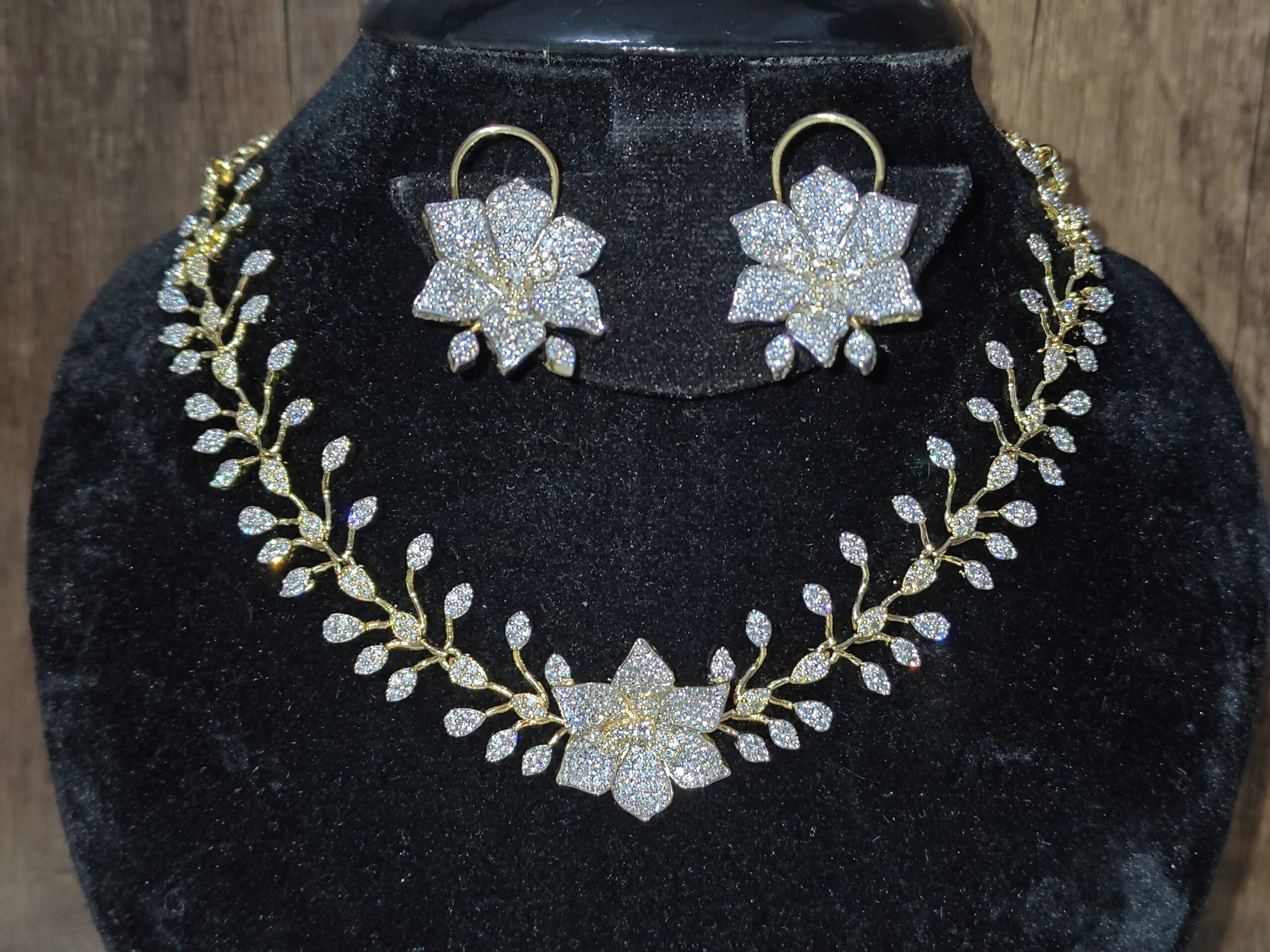 A luxurious diamond-look necklace (NFN194) highlighted with a bold central flower design and sparkling CZ stones. Elegant, eye-catching, and perfect for special occasions
