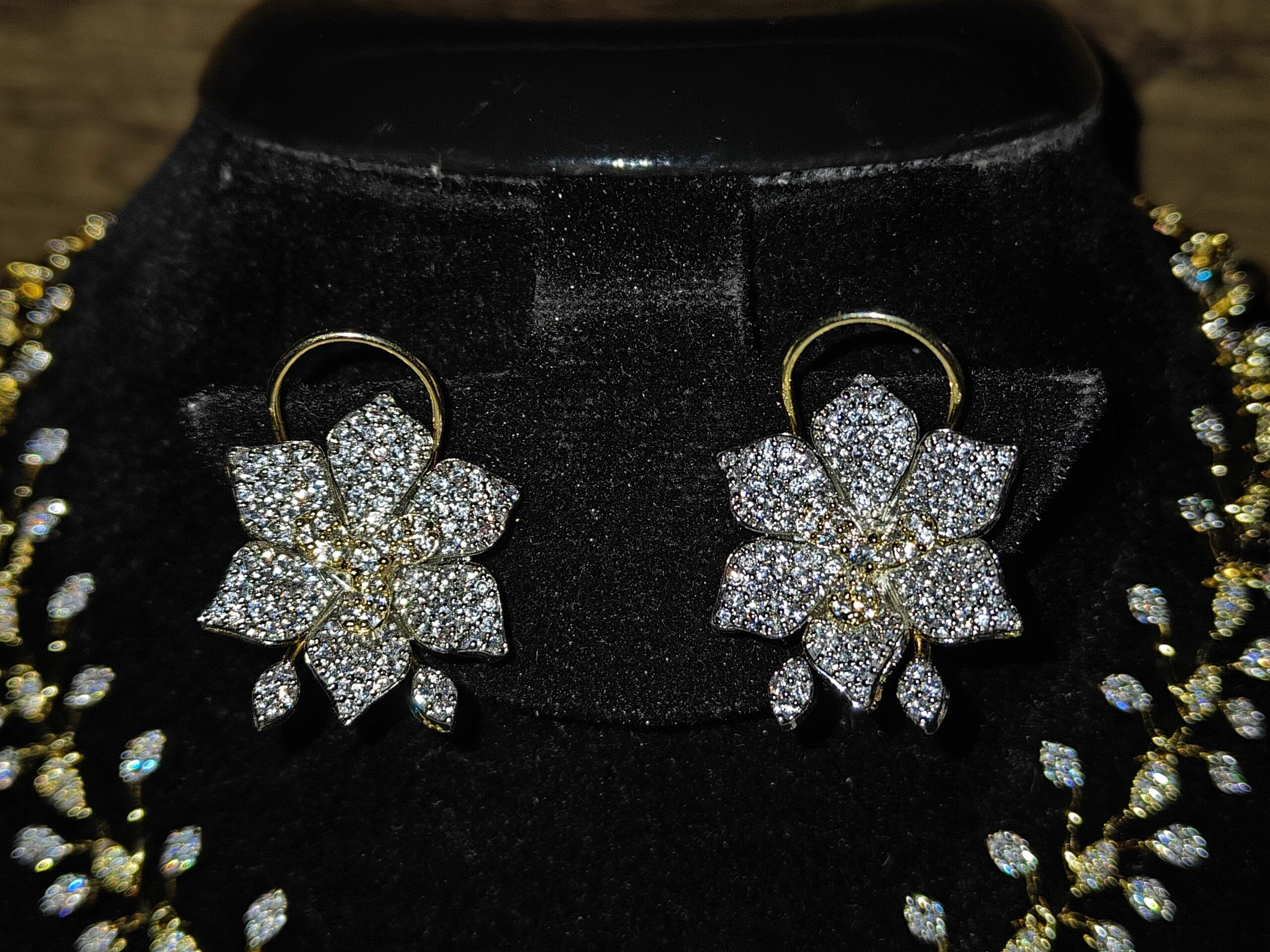 The large centre flower adds a dramatic yet elegant touch, making it ideal for brides, receptions, parties, and festive celebrations. Its balanced design ensures it stands out beautifully while remaining comfortable for long wear. Whether paired with traditional attire or contemporary outfits, this necklace brings glamour and sophistication to your look.