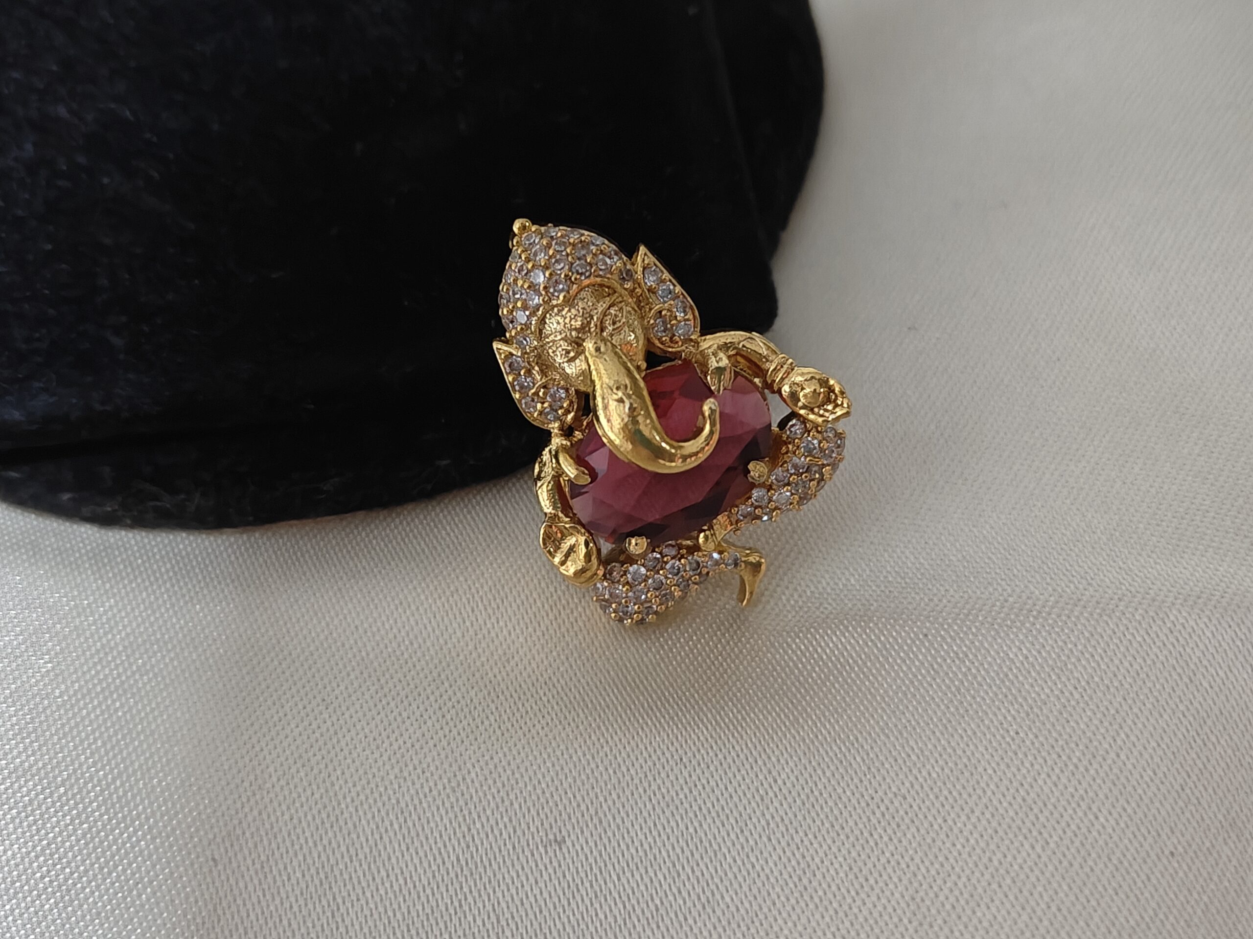 Gold-plated Ganesh pendant with matching earrings, embellished with pink stones. A perfect combination of devotion and elegance for festive wear.