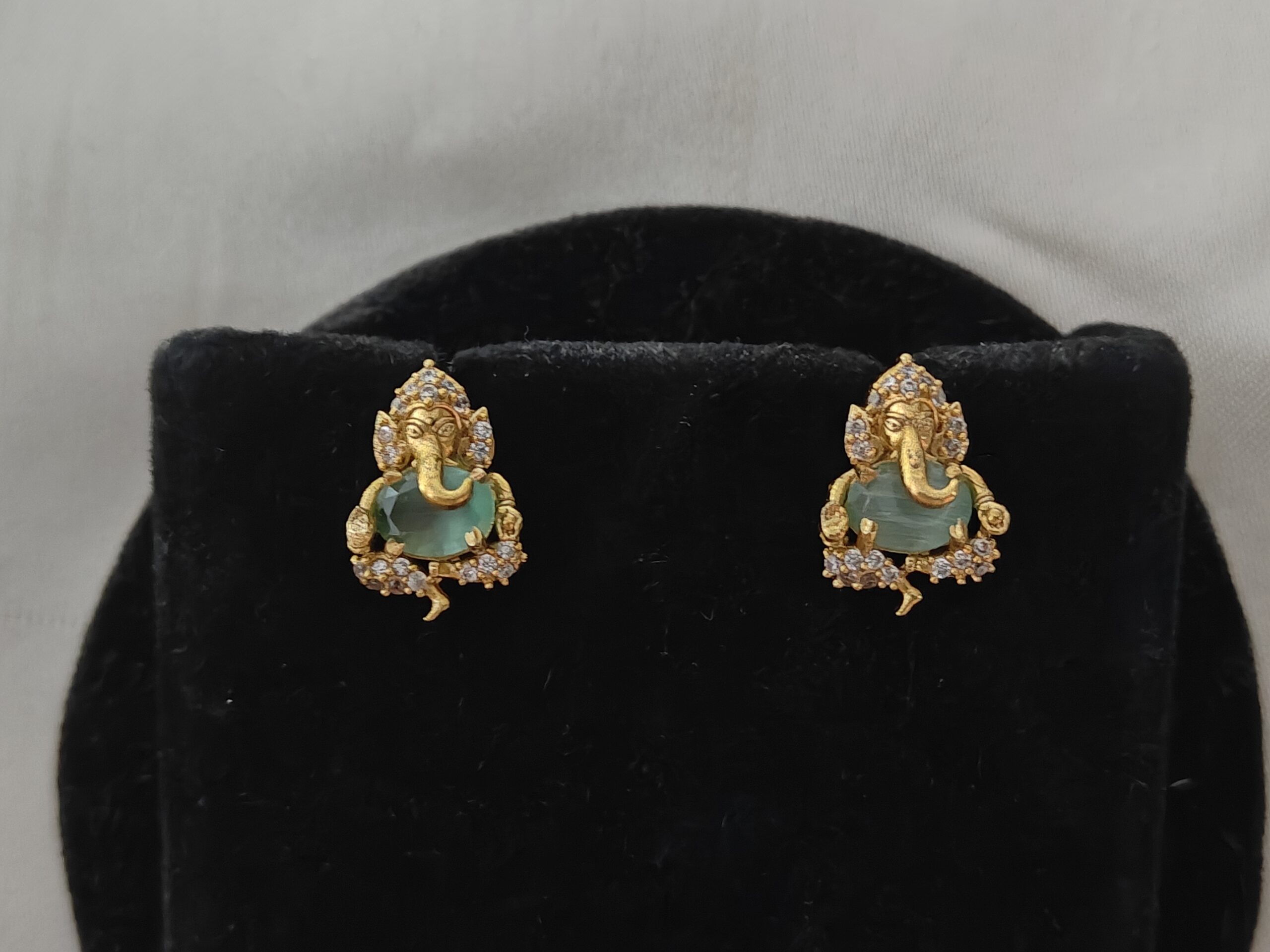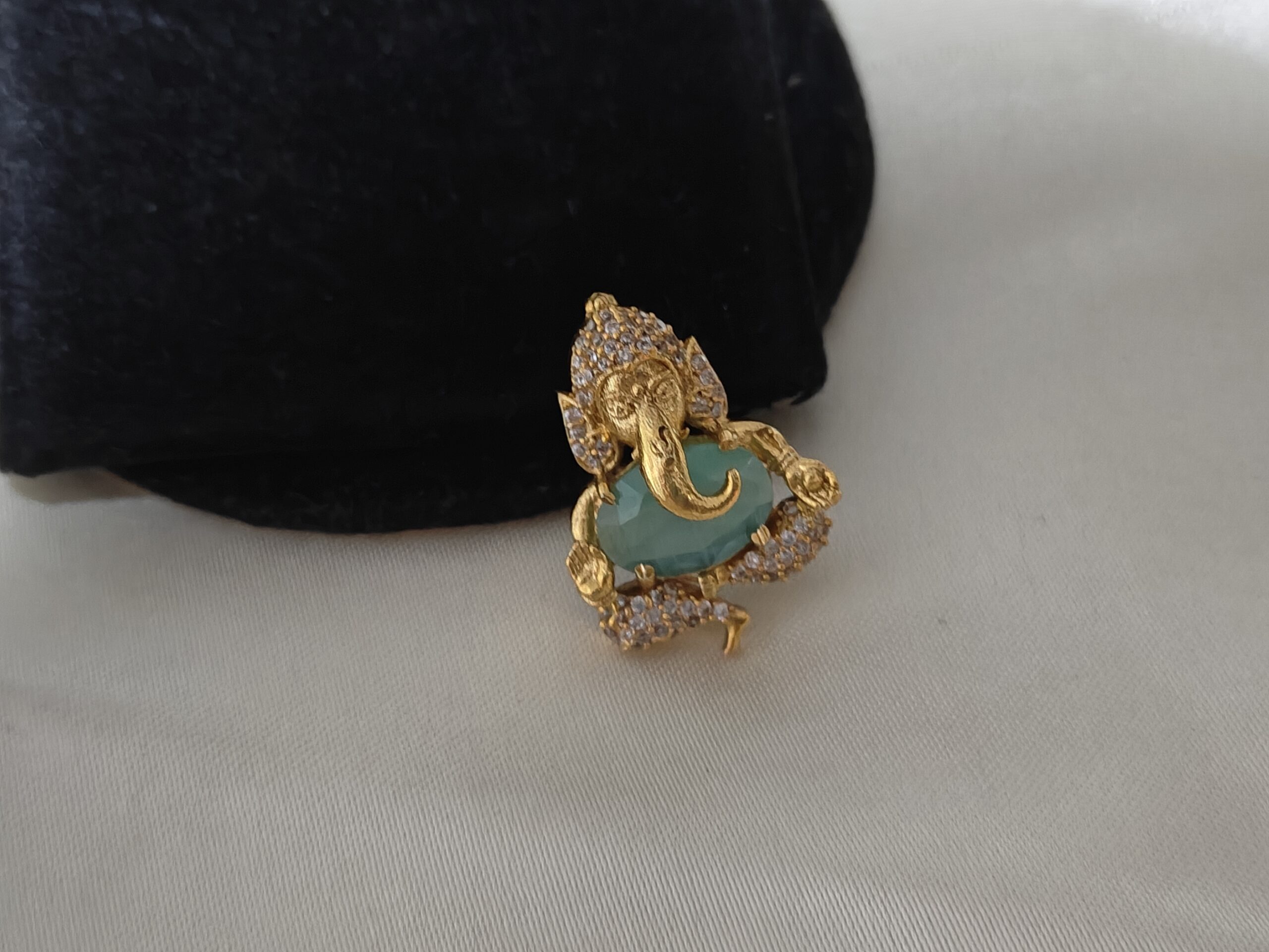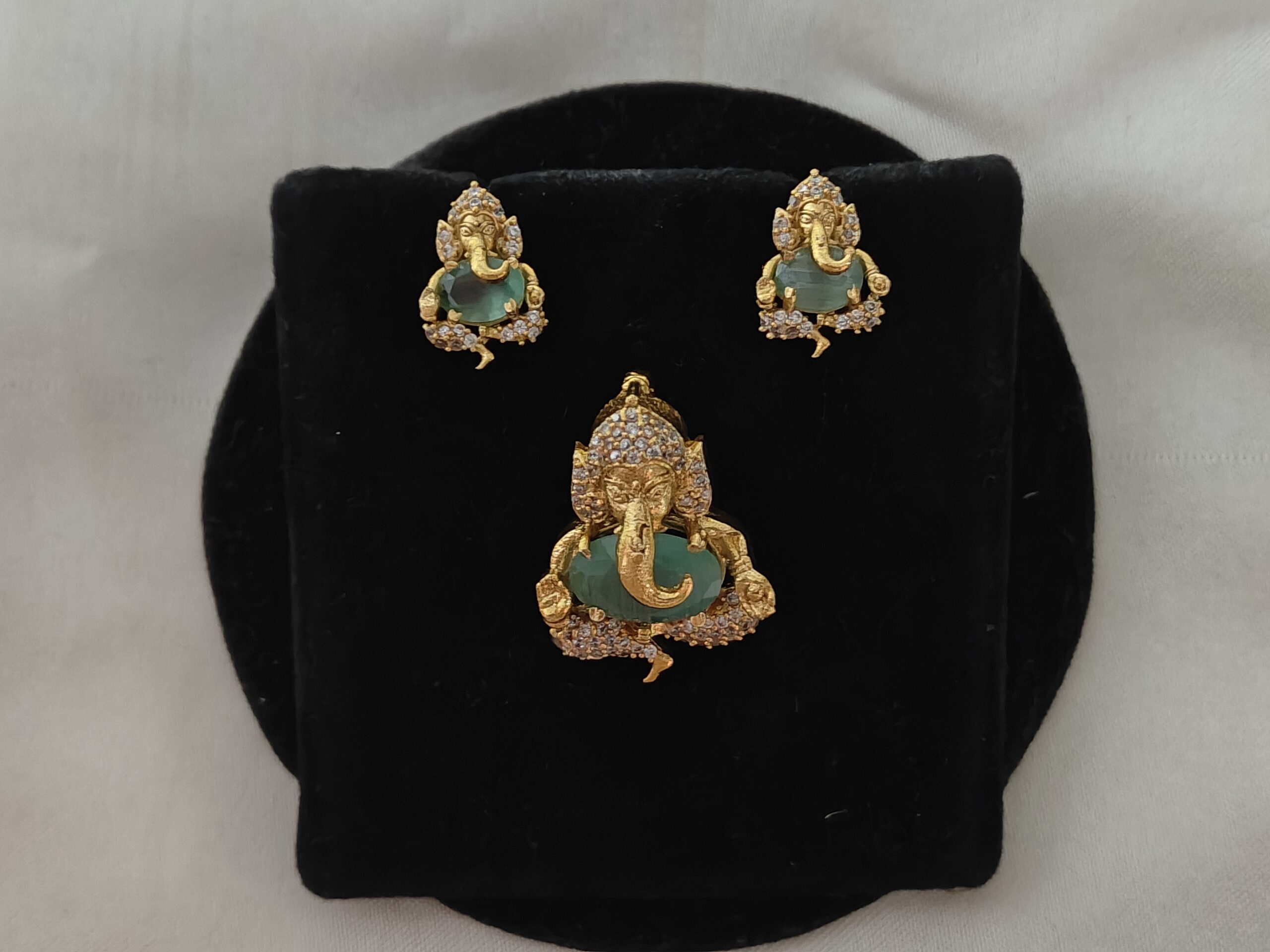 Gold-plated Ganesh pendant with matching earrings, designed with radiant sea green stones. A perfect blend of devotion and elegance for festive and traditional wear.