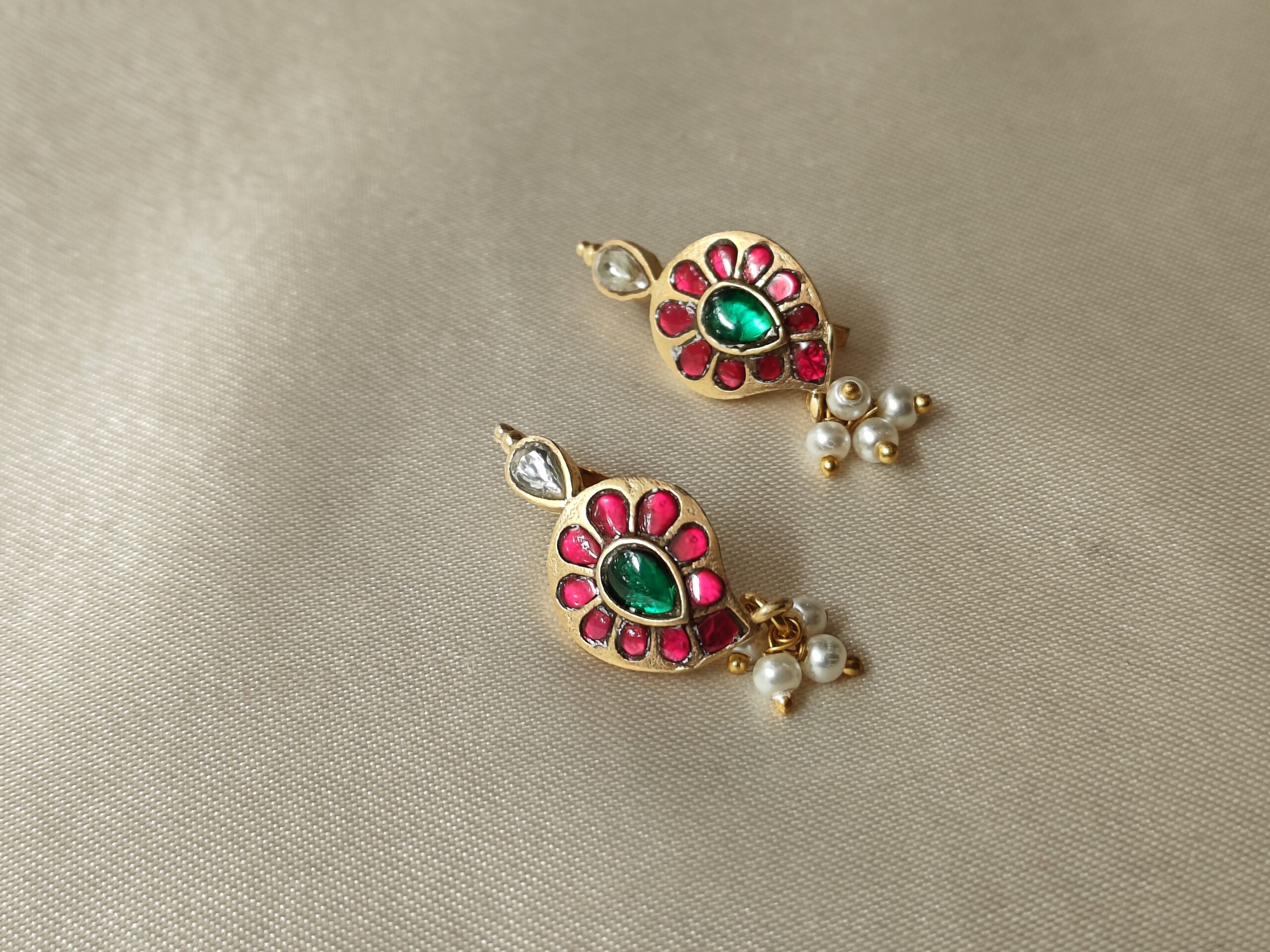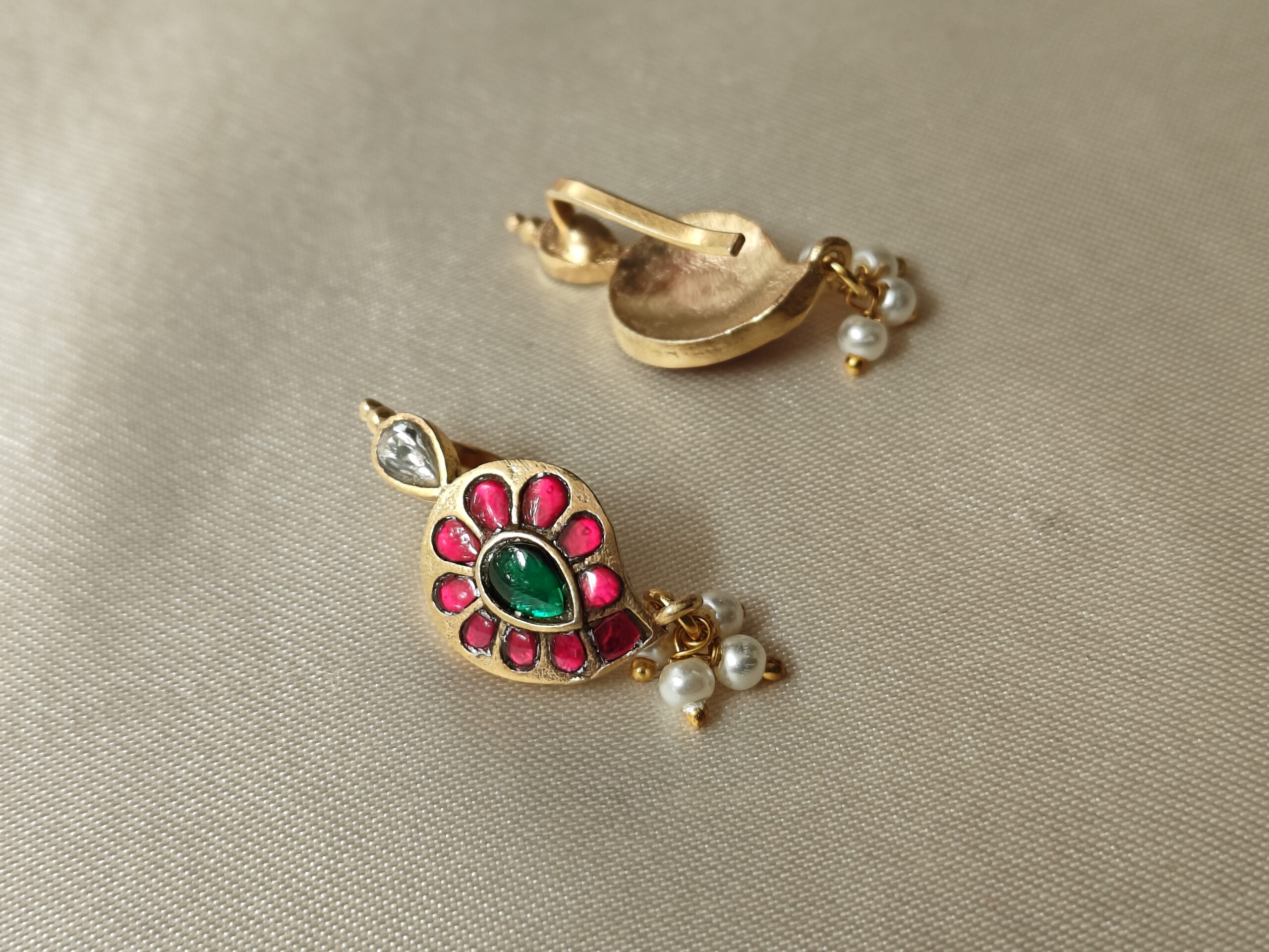 Designed in a classic mango motif, this bugadi is adorned with handcrafted Jadau Kundan stones and finished with delicate pearl drops, reflecting regal craftsmanship.