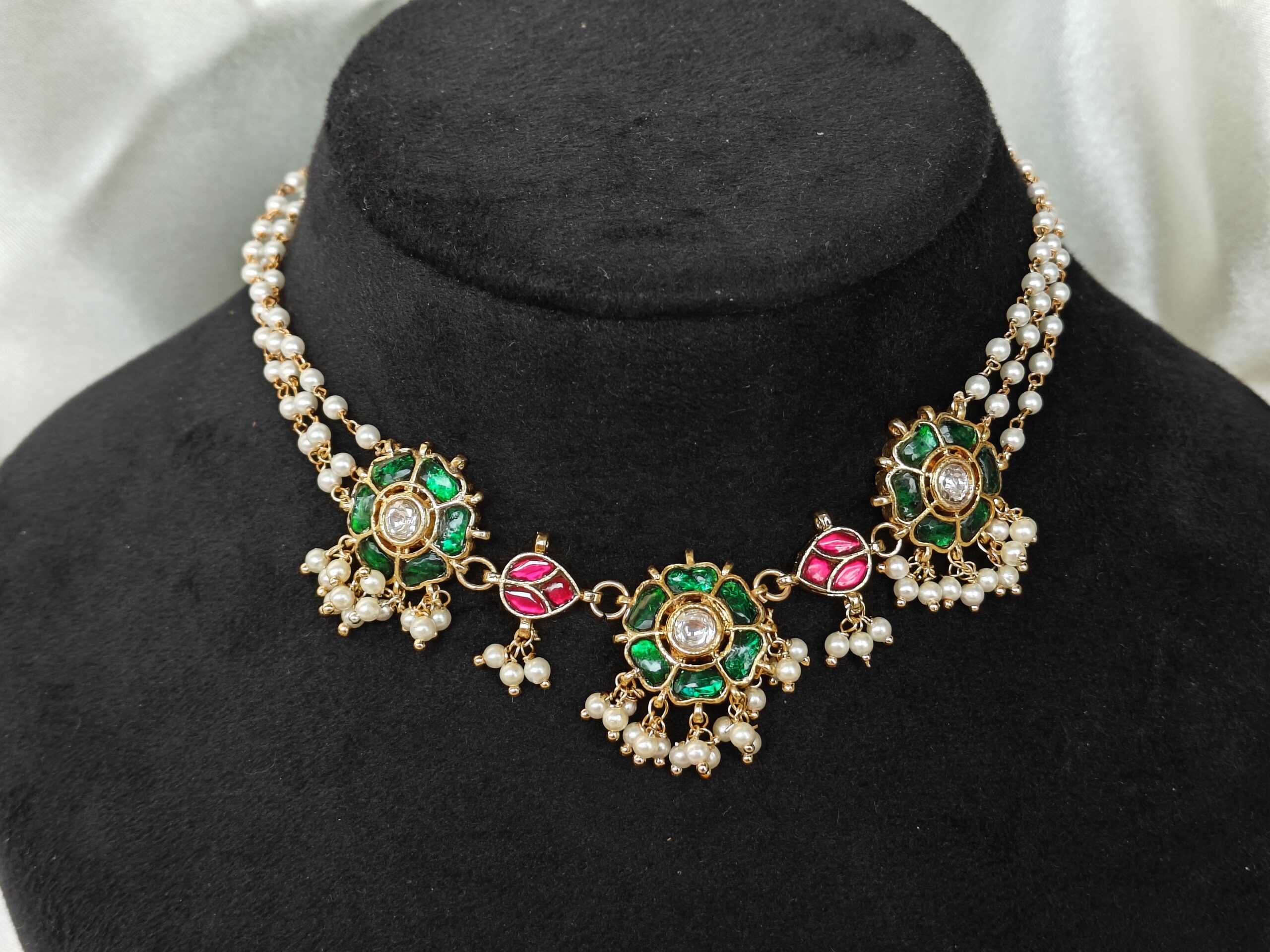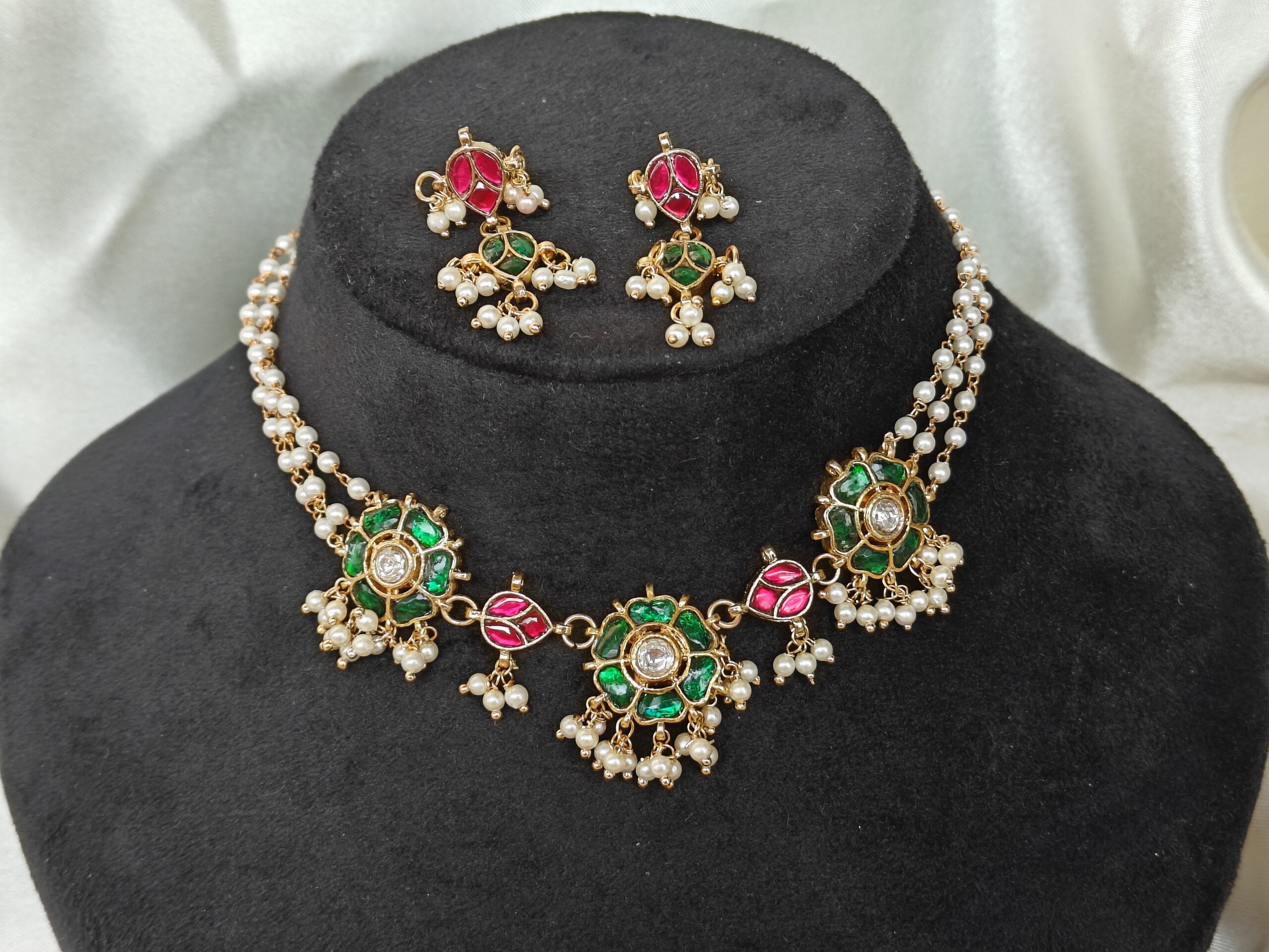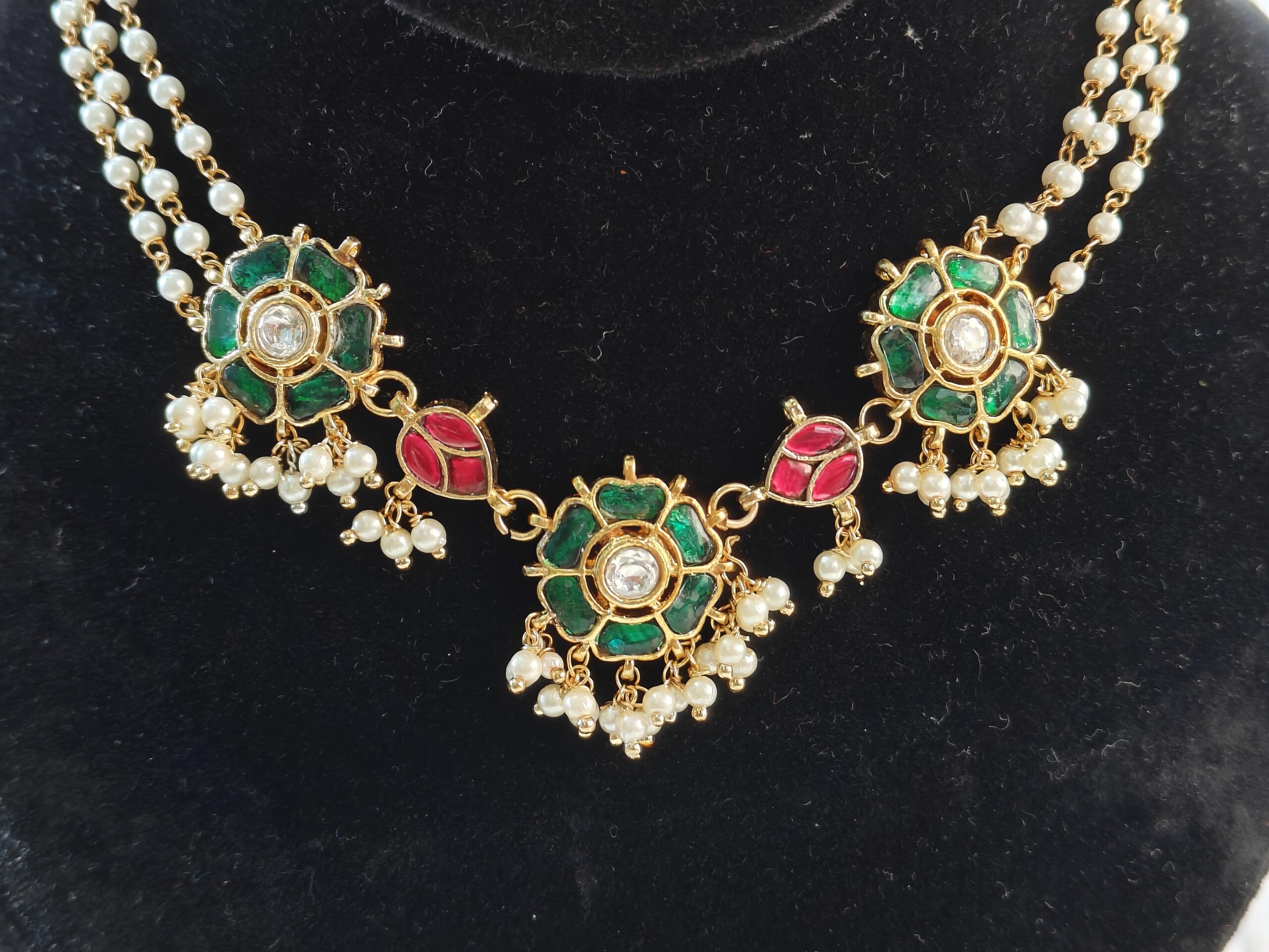 Designed with intricately set Kundan stones, floral motifs and delicate pearl hangings, this necklace adds a rich and graceful touch to any outfit.