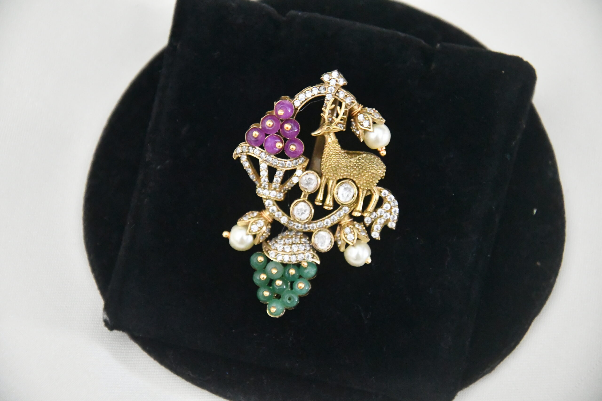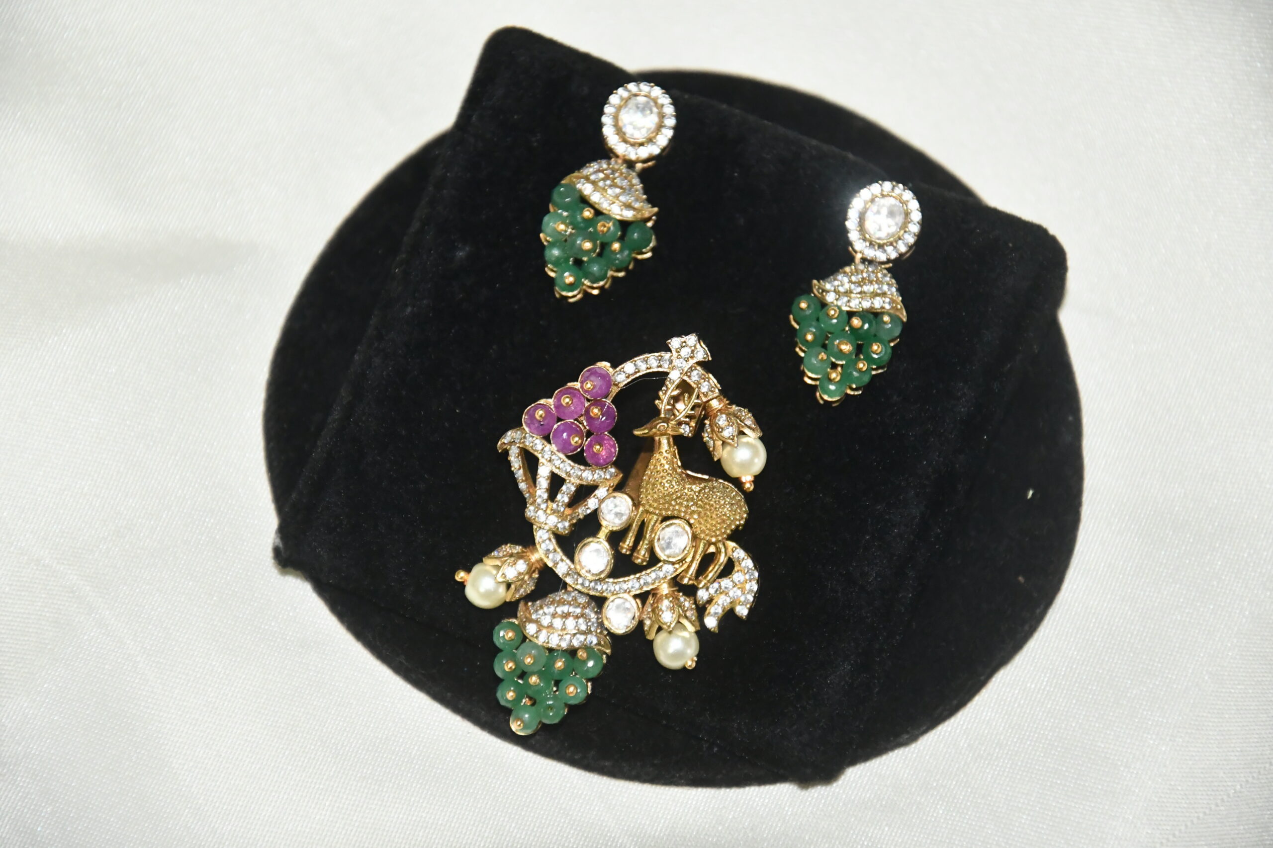 The Victorian deer pendant with earrings NFP22 is a premium jewelry piece that blends artistic craftsmanship with traditional design. Its visual appeal makes it suitable for festive and everyday looks.